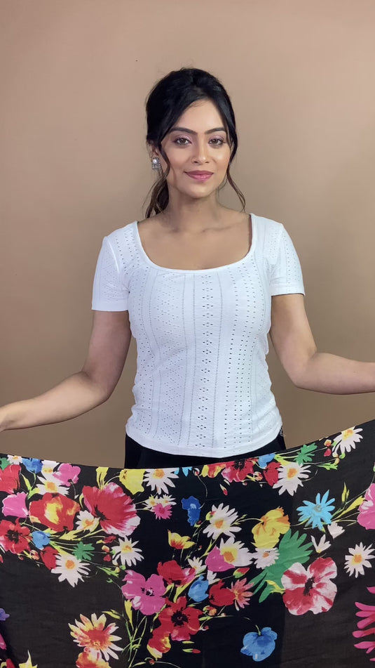 Make a bold style statement with this elegant 100% modal stole, designed in a striking black base adorned with vibrant floral prints. Featuring shades of red, pink, yellow, green, and white, the colorful blossoms stand out beautifully against the deep black background, creating a chic and timeless accessory.
