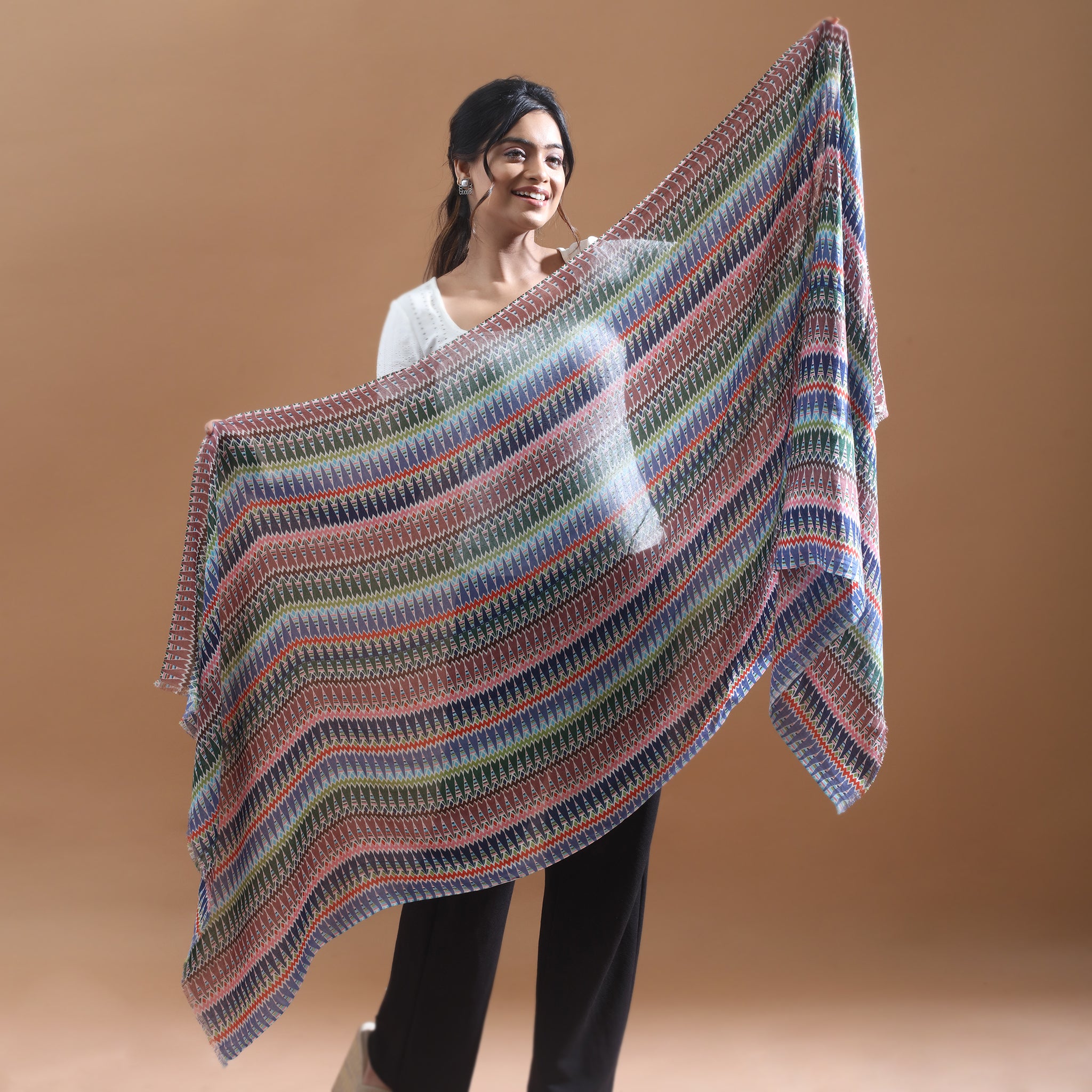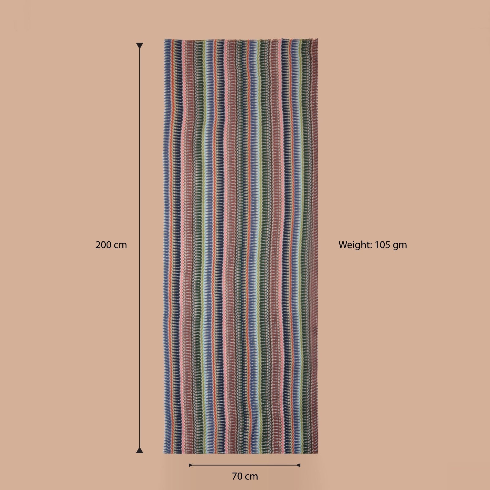 Add a vibrant touch to your everyday style with this lightweight 100% modal stole, crafted for comfort and elegance. Featuring bold vertical stripes in shades of blue, green, pink, and earthy tones, the design blends modern vibrancy with timeless sophistication.