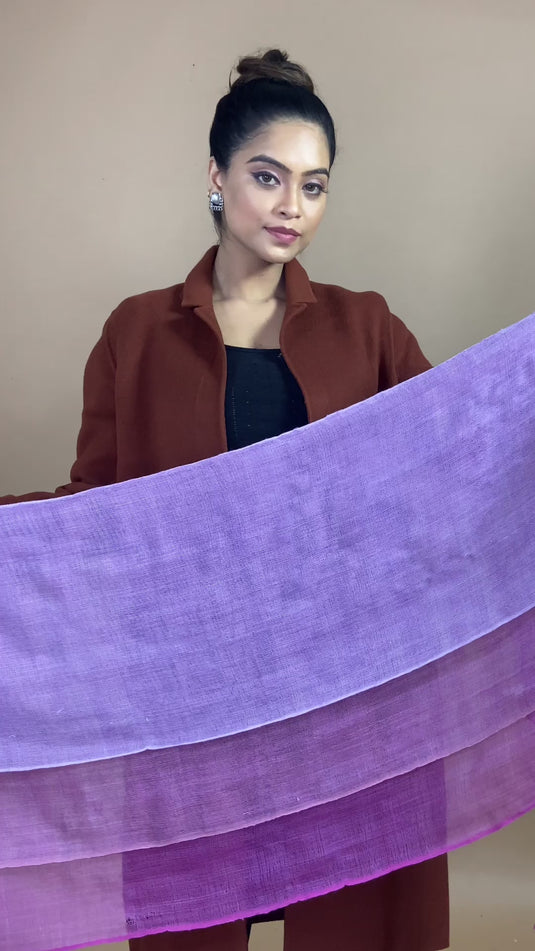 Indulge in luxury with this 100% Merino Wool triple layered stole, beautifully woven in graduating shades of plum, mauve, and lavender. Crafted from ultra-soft Merino wool, this stole provides exceptional warmth while remaining lightweight and breathable.